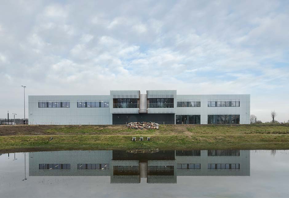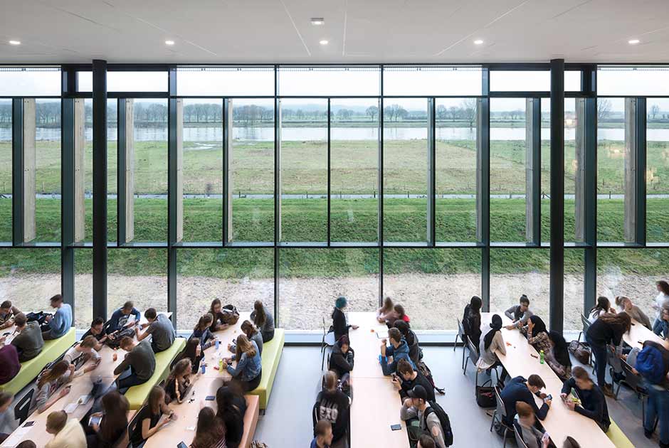 The school is built alongside the river, an important feature that has shaped the design. Transparency and openness are key to the design of the self-sufficient building that is constructed as part of the charming landscape.