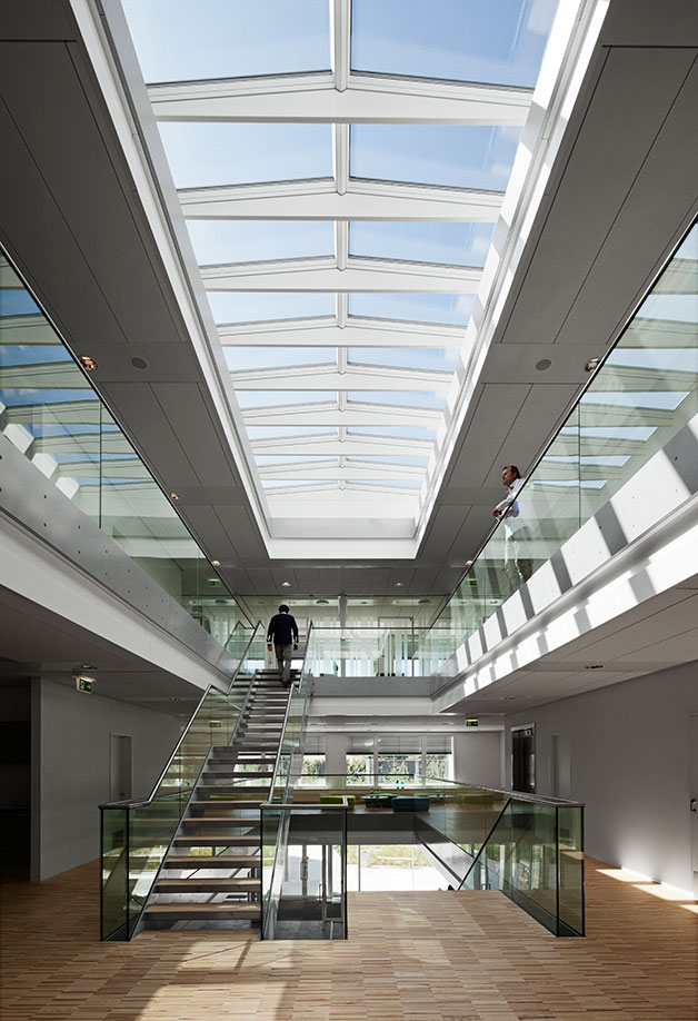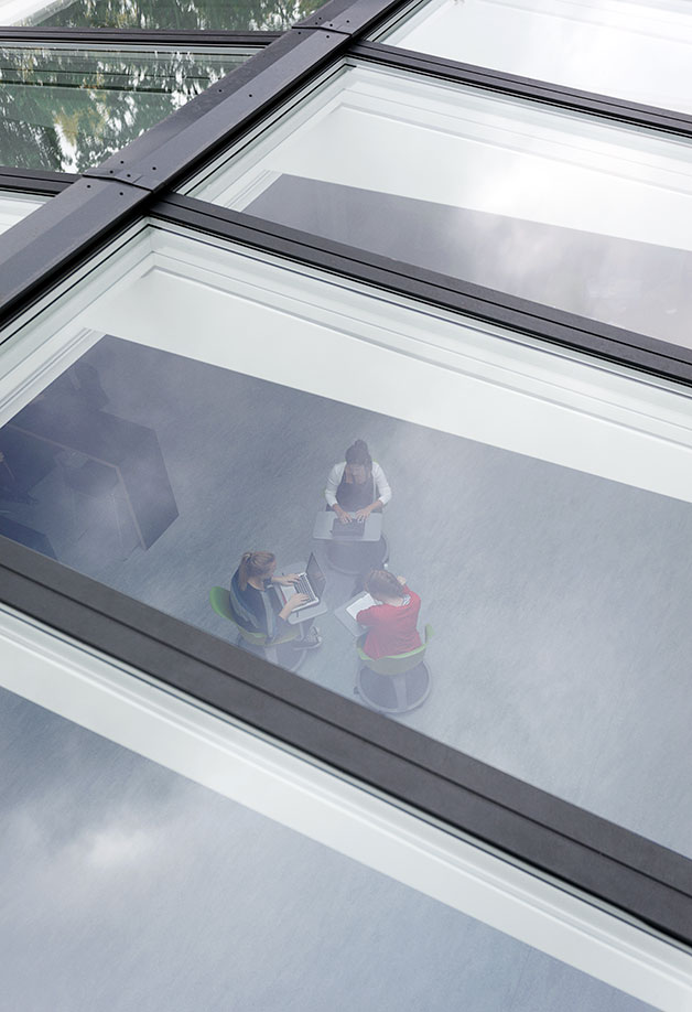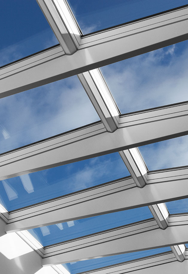 The modular Ridgelight at 5° with beams is the ideal solution for large roof openings, bringing daylight into galleries, circulation areas and small internal courts. The Ridgelights add to the look and feel of the room and create an illusion of a small glass roof.